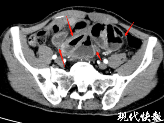 科主任顧新華接診后,結(jié)合劉先生的病史和癥狀,安排了針對(duì)性檢查。術(shù)前CT顯示劉先生的小腸有被纖維膜包裹的“繭狀”結(jié)構(gòu)、腹膜增厚、鈣化等特征,經(jīng)過綜合系統(tǒng)評(píng)估,一個(gè)罕見的診斷結(jié)果浮出水面——腹繭癥。
