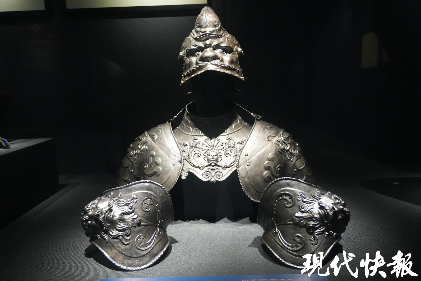 展品中,還有一件把“不服來戰(zhàn)”表情包頂在頭上的盔甲。這套盔甲由頭盔、頸甲、肩甲和肘甲組成,頭盔上描繪了一條海豚和法翁的面孔,法翁是羅馬神話中半人半羊的畜牧之神,其形象被用作冠飾。法翁在這件盔甲上的形象非常威武,雙眉緊鎖、眼神睥睨,鼻孔微張仿佛喘著粗氣,一副“不服來戰(zhàn)”表情。此類深受古典文化影響的盔甲在文藝復興時期得到了極大發(fā)展,主要用于主題比武大賽、馬上芭蕾和其他結(jié)合軍事竟技與古典幻想的表演活動。這套盔甲也是屬于馬丁嫩戈家族的“古典風格”盔甲收藏,應是米蘭鑄甲師喬萬尼·保羅·內(nèi)格羅利工坊的作品。