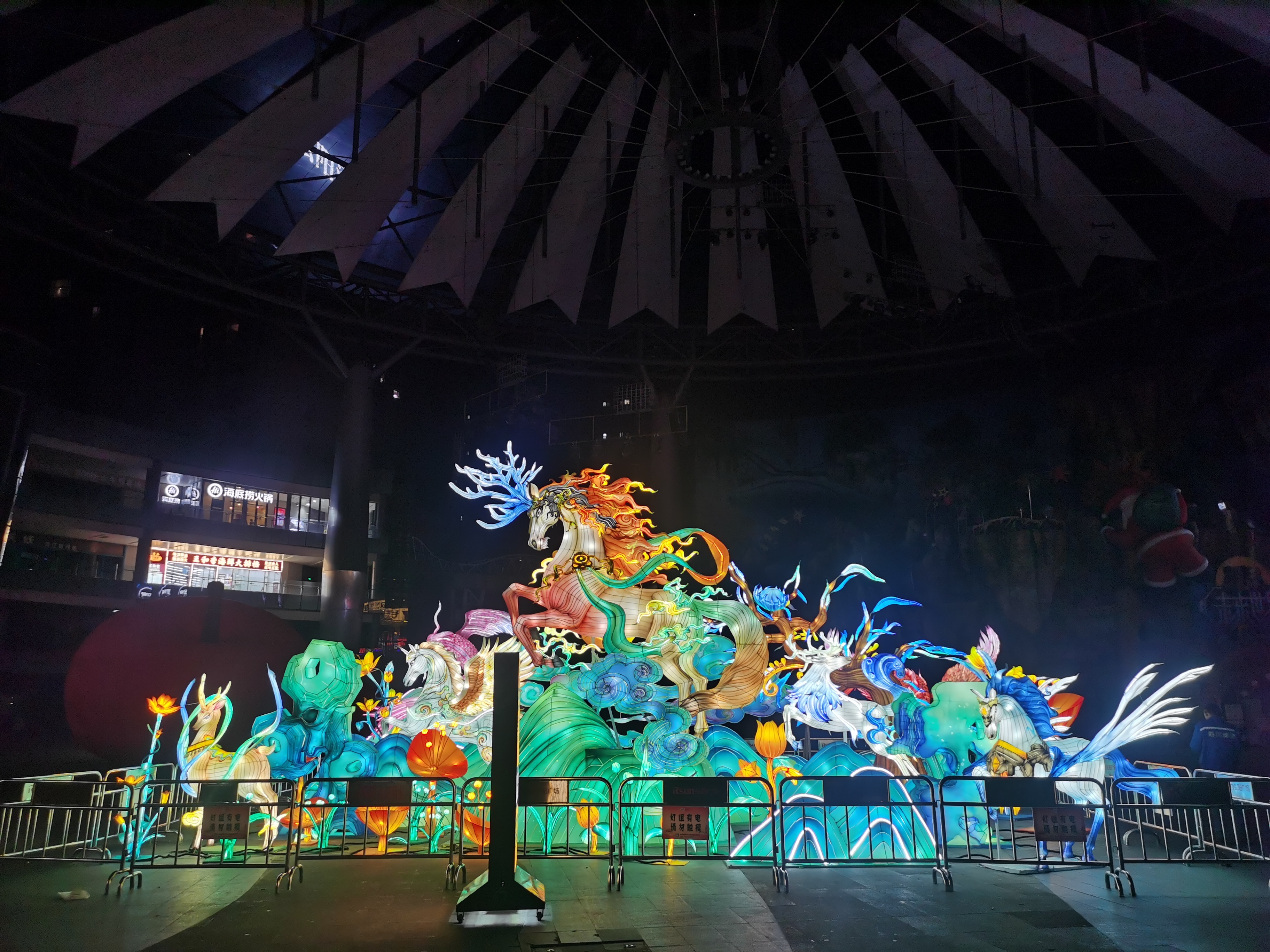 12月23日晚,記者在橋北商圈分會場看到,現(xiàn)場的各個燈組已基本安裝完畢。在弘陽廣場,一組“山海神獸”主題燈組成為不少市民的打卡點,其主體為一尊融合馬、鹿特征的神駿造型,鬃毛是紅橙漸變的烈焰,鹿角以青藍漸變打造,搭配騰躍的身姿盡顯靈動。燈組周邊環(huán)繞鳳凰、錦鯉等神話靈物,與青綠波浪、云紋造型交織,構(gòu)建出層次豐富的“山海靈境”視覺觀感。