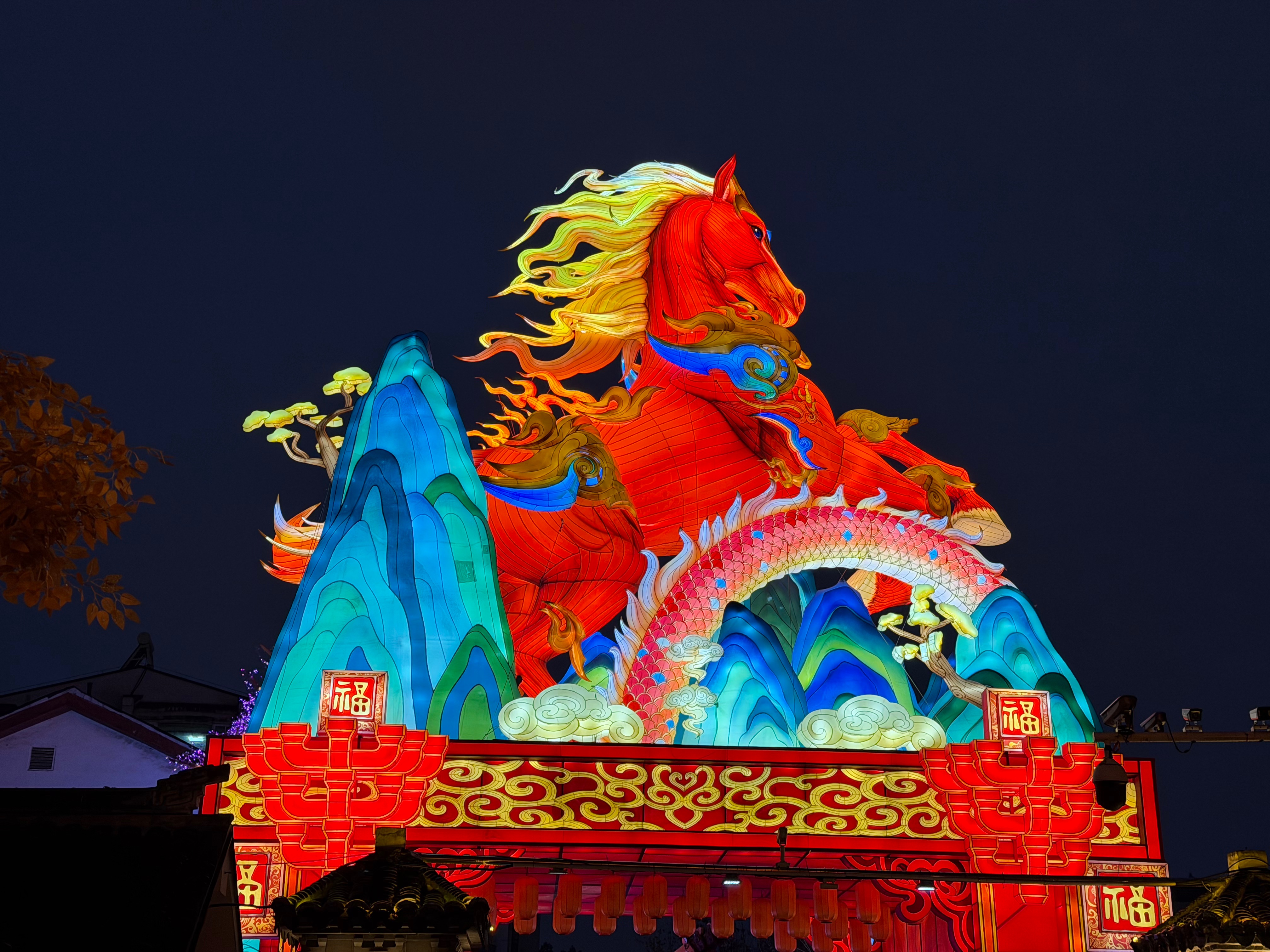 夜幕低垂,每年都備受關(guān)注的平江府路牌坊和公園西門,被“龍馬精神”和“馬到成功”燈組徹底點亮,只見15米高的赤焰駿馬前蹄騰空,鎏金鬃毛裹著流光肆意翻卷,身上青藍云紋燈片隨光影漾開,馬身之下是層疊的碧色山巒燈,左側(cè)龍尾狀的燈架翹著橙藍焰尾,右側(cè)火鱗燈柱纏滿了櫻粉色燈簇,活脫脫把“龍馬”的模樣鋪在了西門口。